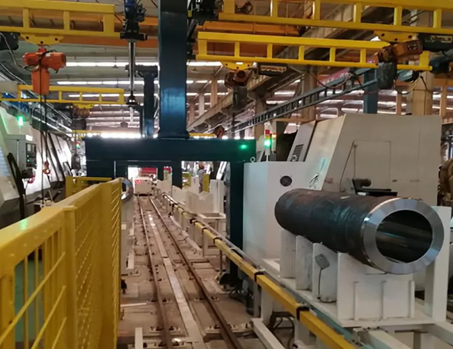作為煤炭采掘設(shè)備的核心部件中缸筒,其中缸和外缸尺寸不一,但都是大型設(shè)備:最重的有1.5噸,長(zhǎng)度達(dá)2.5米。在生產(chǎn)過(guò)程中,如何對(duì)它們進(jìn)行穩(wěn)定運(yùn)輸,并在較短時(shí)間內(nèi)完成多個(gè)加工工序成為一大難題。原來(lái)各個(gè)工序之間的物流都是由工人通過(guò)行吊完成,不僅費(fèi)時(shí)費(fèi)力,而且存在安全隱患。另外,由于加工設(shè)備布局分散,物流倒短時(shí)間長(zhǎng),導(dǎo)致生產(chǎn)效率難以提高。